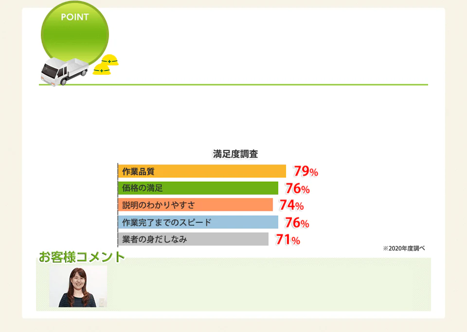 希望通り作業してくださり、また、とても親切に対応してくださいました。一生懸命作業してくださったと思います。雨の中迅速に作業してもらいありがとうございました。